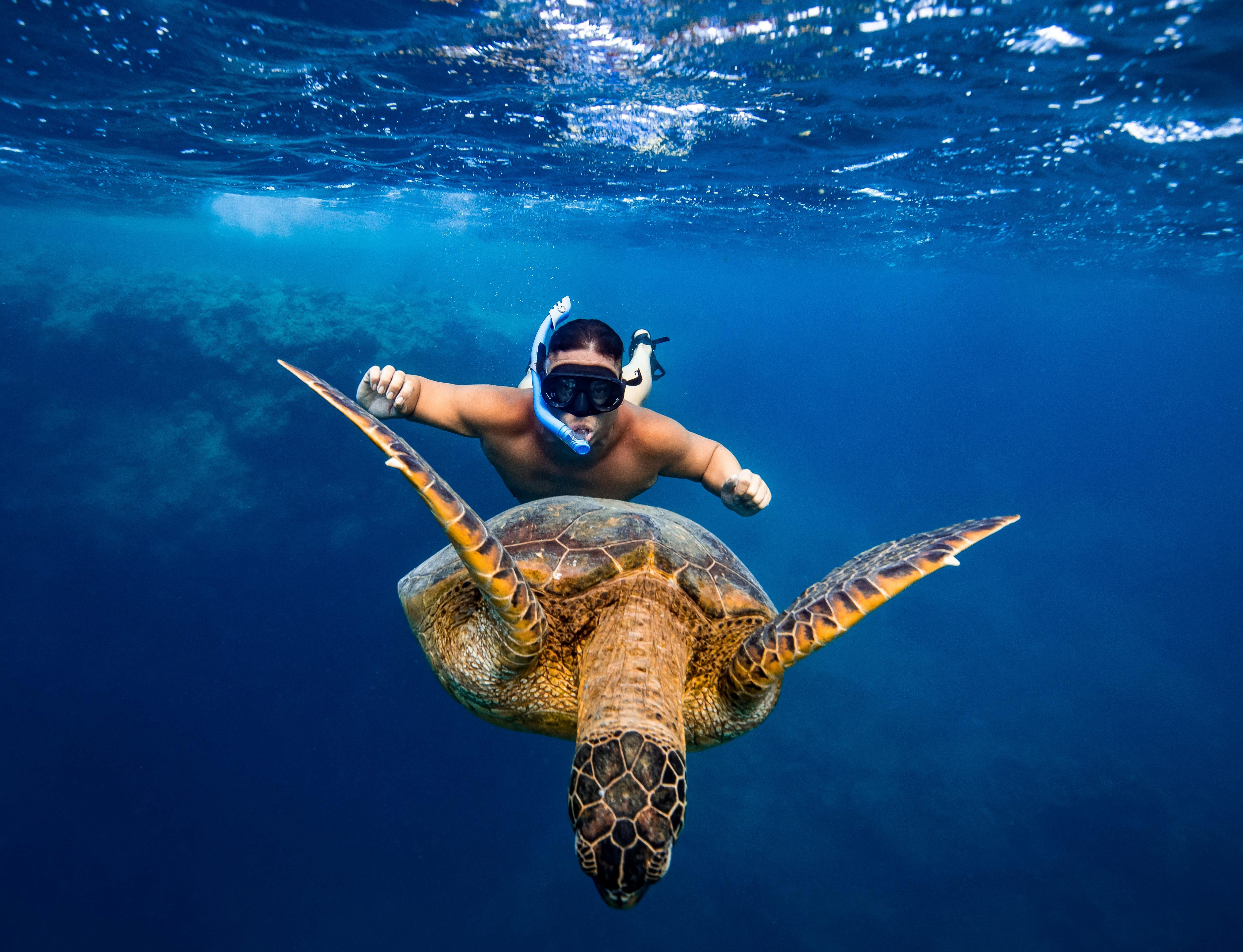 When you spot a turtle while snorkeling, kayaking, or paddle-boarding, STOP! This will allow the turtle to determine if it is open to human company or not. If they are scared, they will disappear quickly, so do not try to pursue them as they can swim infinitely faster than you can. If the turtle hangs around, only move very slowly, keeping at least 2 meters (6 feet) distance. If the turtle feels safe, you may be able to swim alongside it for 15 minutes or more.