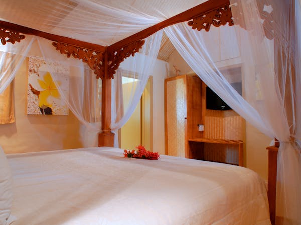 All Deluxe Beachfront Suites are just steps away from the water’s edge, and all are at beach (ground) level. These lovely suites feature a private Polynesian style Open Air Outdoor Shower (in addition to an indoor shower and bathroom)and a romantic 4-Poster Master Bed.