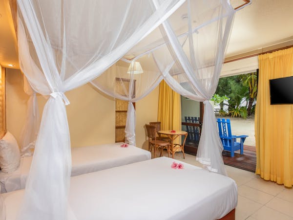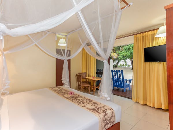 Half of our Beachfront Rooms are located on beach level, and half are on a second level. Do you prefer direct access to the beach from your deck, or a vaulted ceiling and views across the beach and lagoon from your second-level verandah?