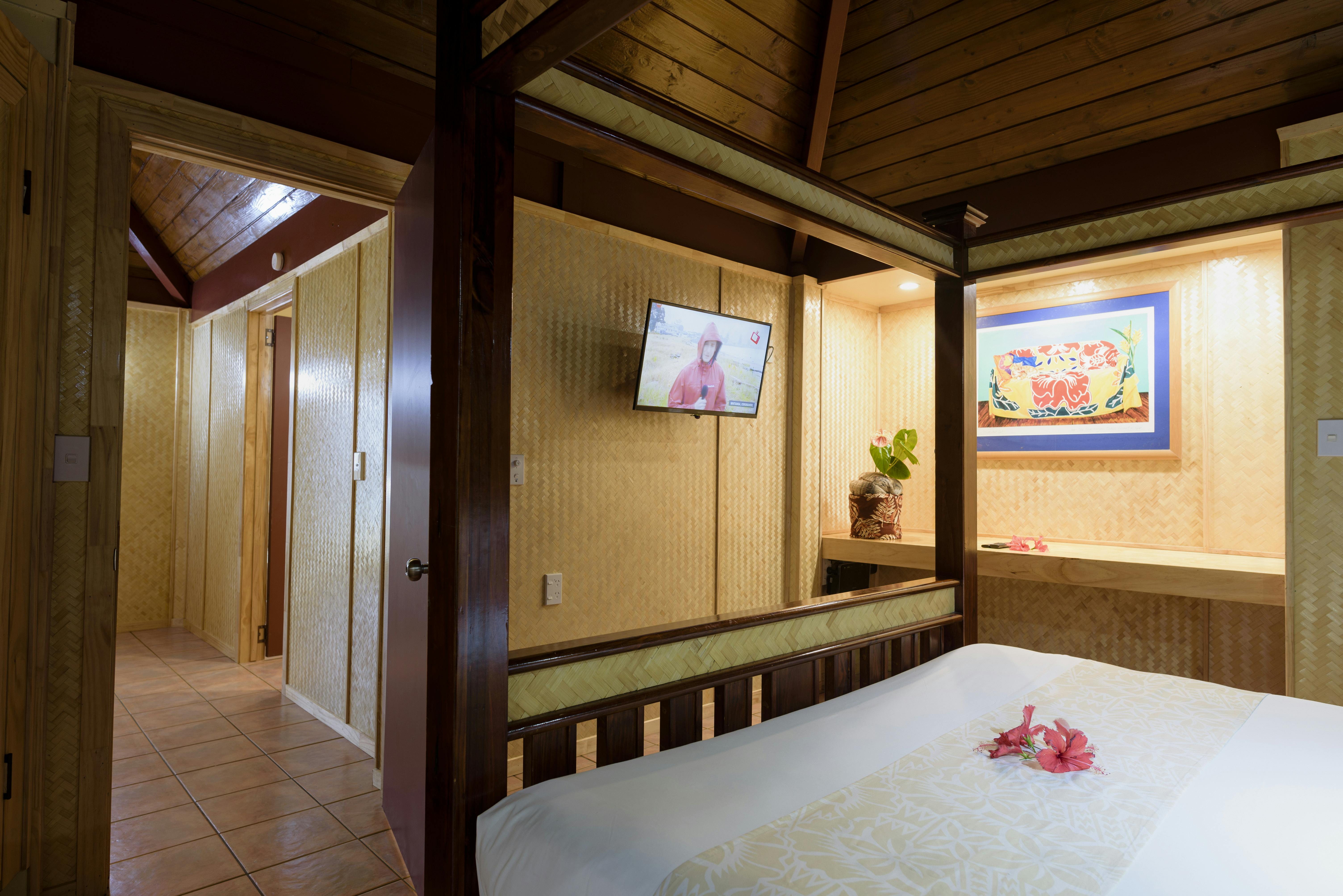 For families with up to 4 children, The Rarotongan Beach Resort & Lagoonarium now offers an exciting new 2-bedroom option with kitchen – set directly on the stunning white sands of Aroa Beach! Our new 2-Bedroom Grand Beachfront Suites offer a master bedroom with 4-poster bed and TV, a children’s bedroom with its own TV for up to 4 children to age 16 inclusive, indoor bathroom with shower, and a separate private open-air shower for that glorious Polynesian-style showering experience. There’s a lounge and dining room with its own TV and great beach and lagoon views, and the kitchen features a breakfast bar, refrigerator with freezer compartment, stovetop, microwave, and tea/coffee making facilities. All areas have their own air-conditioning, and it’s all topped off with an expansive private verandah with dining table & chairs and sunloungers to really relax and soak up our special island vibe. The 2-Bedroom Grand Beachfront Suites offer some of Rarotonga’s best beach and lagoon views along with great indoor-outdoor flow to the white sands and the welcoming sparkling blue waters of Aroa Lagoonarium Marine Sanctuary just a few steps from your door. Currently we only offer two of these fabulous suites.
