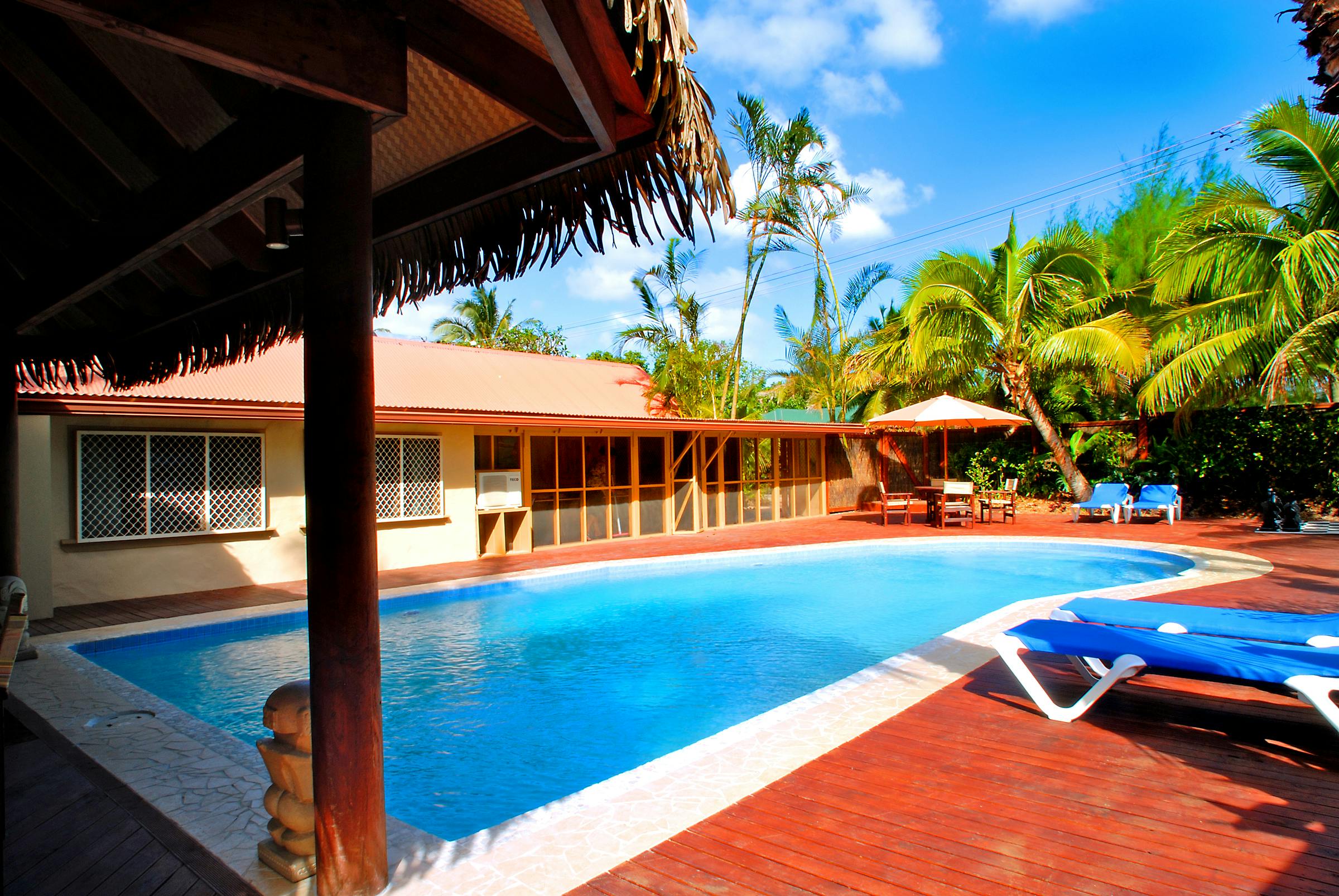 3-Bedroom Private Pool Villa Onemaru offers 770m2 of wonderful, completely private vacation retreat across the main circle island road from Aroa Beach which includes a large Fresh Water Swimming Pool with spacious Sun Deck for great BBQ get-togethers, along with a stylish thatched Pool Pavilion, all completely enclosed in private landscaped Tropical Gardens.