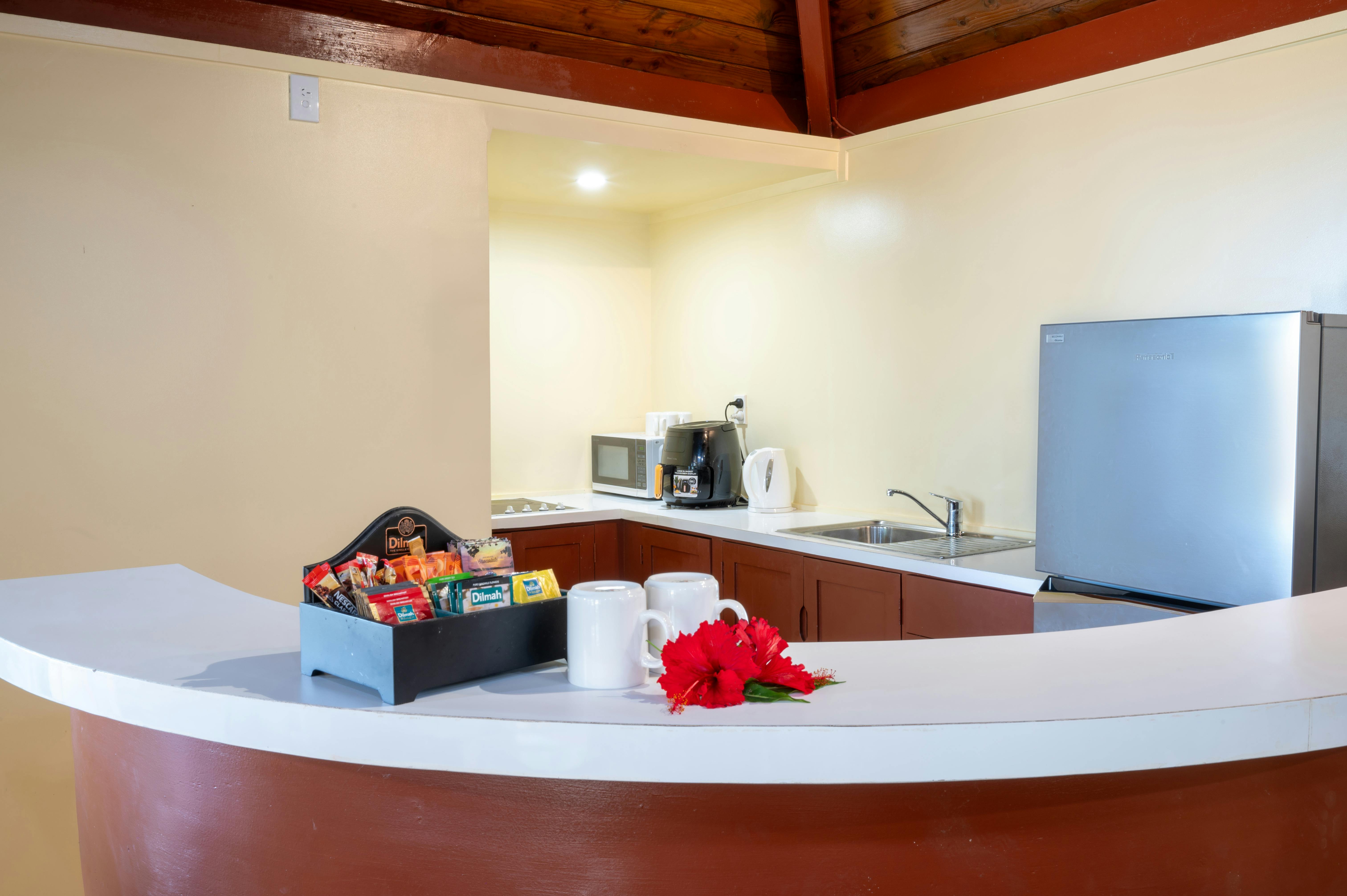 The extra-spacious. tropical-style open-plan interior features terracotta tiles throughout, a 4-Poster King Bed, Bathroom with Walk-in Shower, Private Polynesian Style Open-air Shower, Kitchen (with breakfast bar, microwave, stovetop, full-size refrigerator and tea/coffee making facilities), Dining setting and Lounge area with Satellite Flat-screen TV.