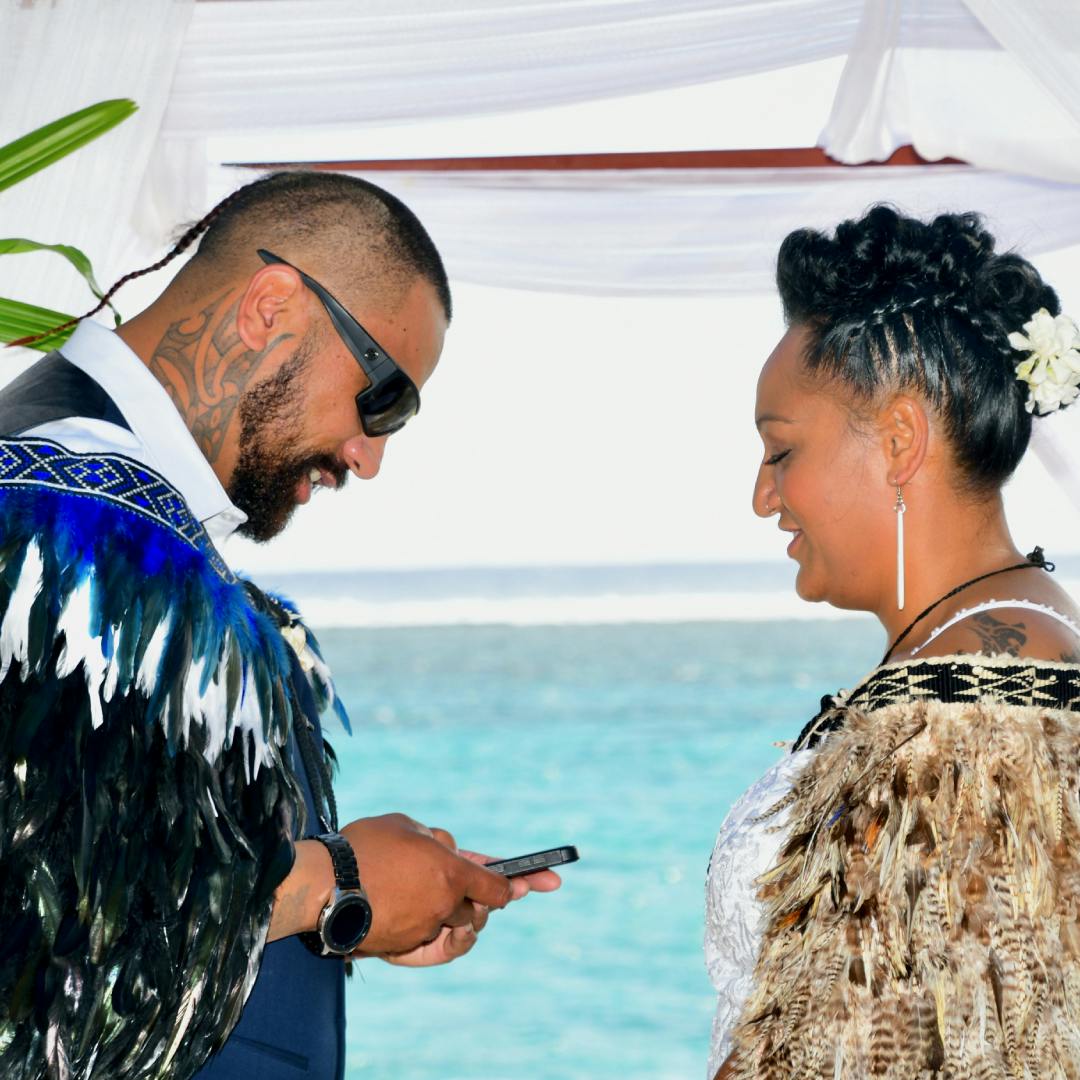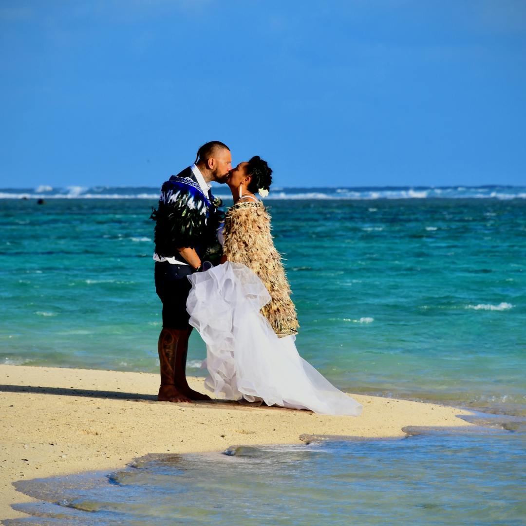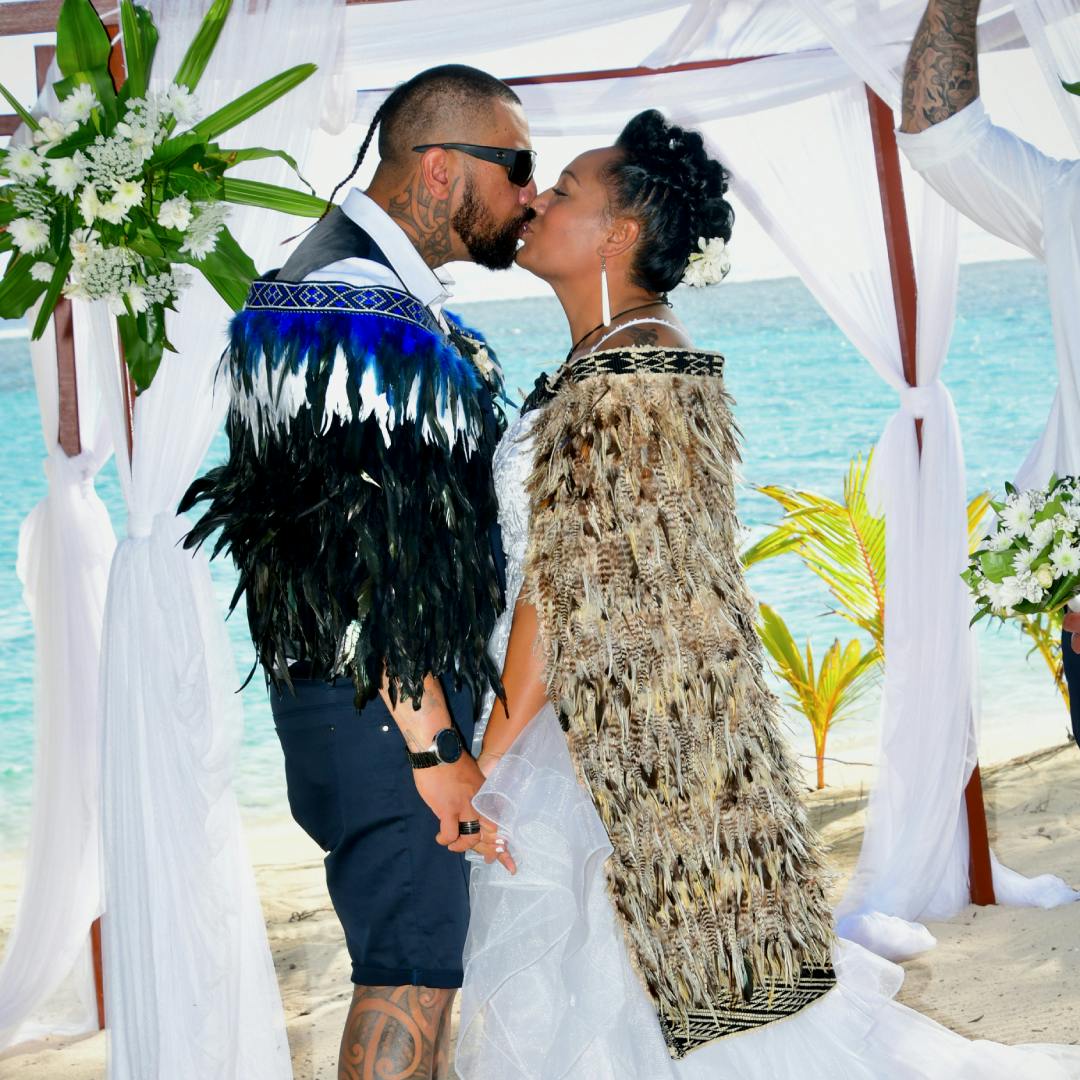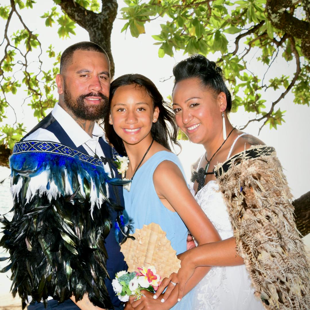 The longtime couple, now hailing from Bracken Ridge, Queensland, Australia, were witnessed by 12 year old daughter Aysha and almost 60 whanau and friends when they pledged their love under the tropical sun beside the Lagoon of Love, Aroa Lagoon.